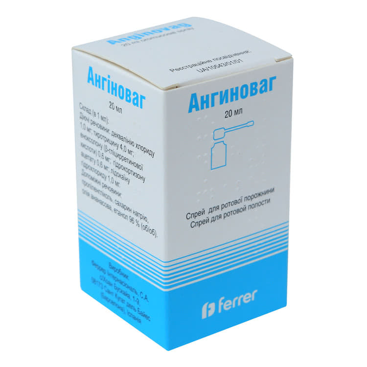 | Ангиноваг спрей 20мл | Испания | 2 960 руб. | 1 флакон, который содержит 20мл спрея |