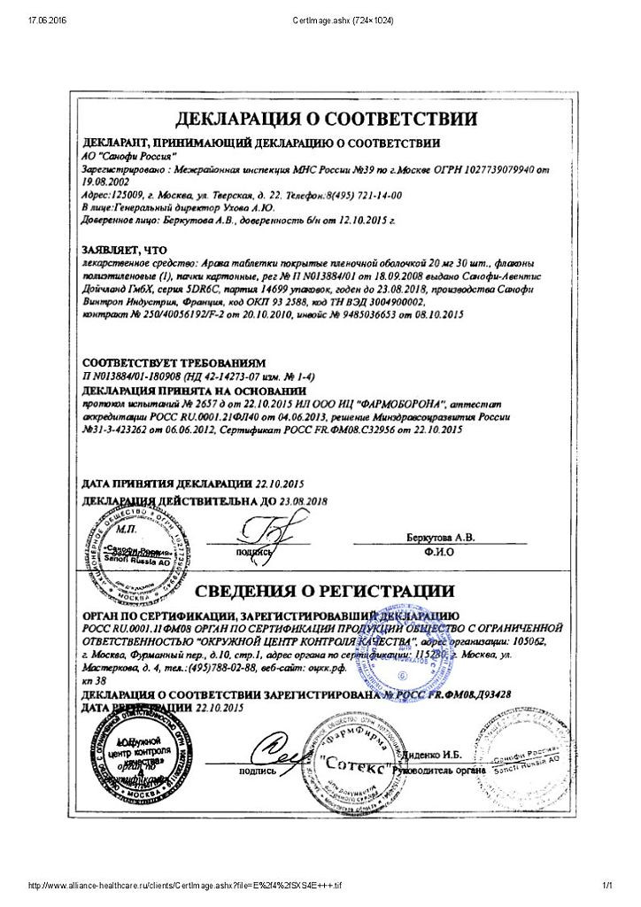 Реализация изделия осуществляется согласно рецепту. Арава табл. 20мг №30 находится в свободной продаже: купить лекарство можно в аптеке, магазине, интернете. Более подробную информацию вы можете найти на сайте производителя, там же можно оформить заказ на крупную партию товара.