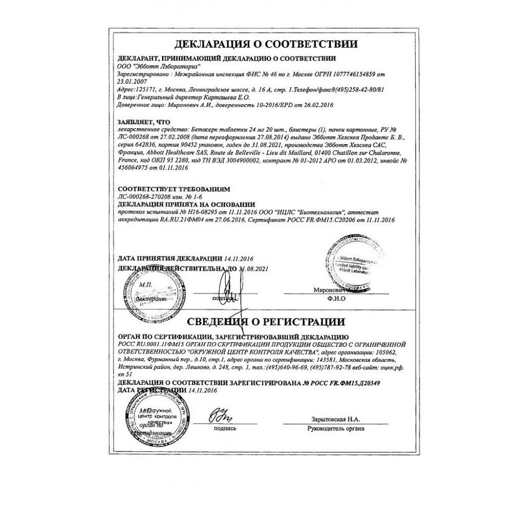 Лекарственное средство выпускается в форме таблеток с дозировкой 8, 16 и 24 мг активного компонента. Лекарственная форма упакована в пластиковые блистеры. Количество таблеток в упаковке зависит от дозировки Бетасерка — по 20 или 60 шт. в коробке.