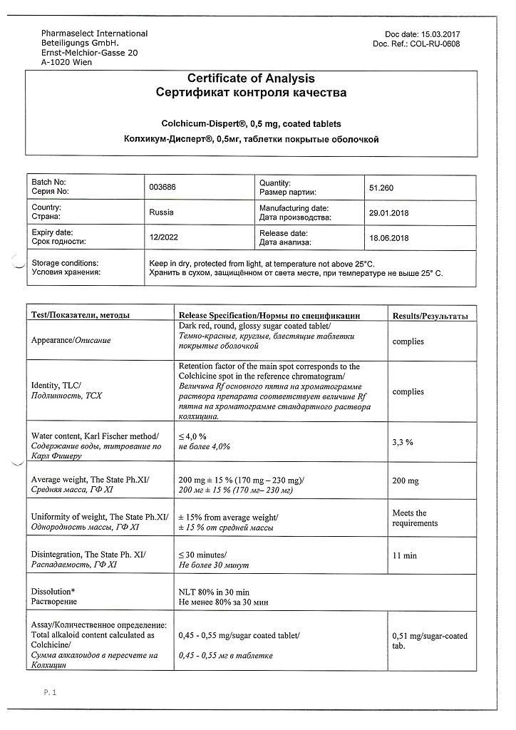 | Колхикум дисперт 0,5мг №20 | Австрия | 3 290 руб. | 20 таблеток по 0,5мг |
