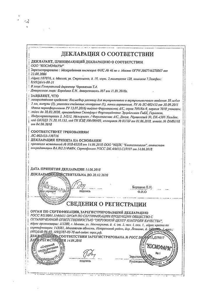 | Космофер 50мг/мл 2мл ампулы №5 | Дания | 25 010 руб. | 5 ампул по 2мл |