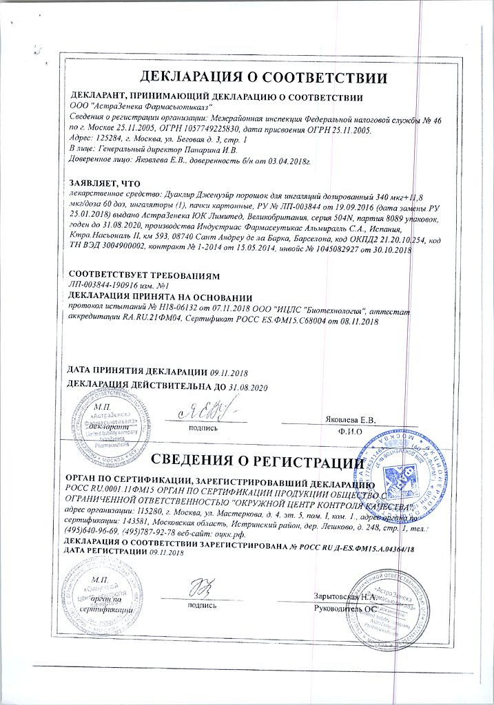 Прежде чем купить Дуаклир Дженуэйр 340мкг 11,8мкг/доза в ближайшей аптеке, нужно обязательно проконсультироваться с врачом. Самолечение опасно для Вашего здоровья.