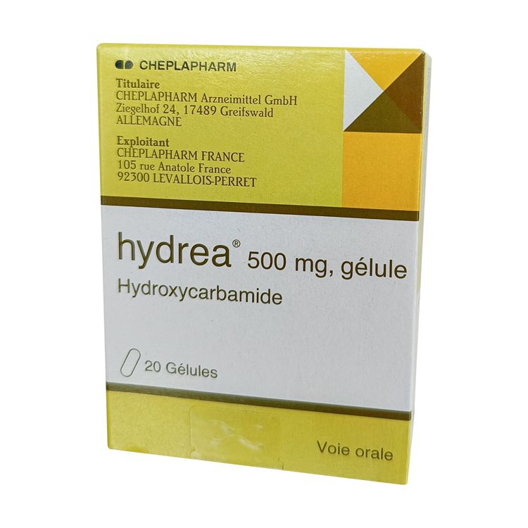 Лекарство поставляется в картонной коробке с маркировкой, на которой указано название "Hydrea 500 mg", форма ("gélule") и количество капсул (20 шт).