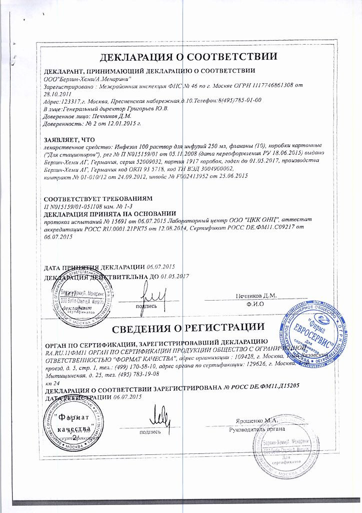 Инфезол не следует смешивать с другими лекарствами в одном флаконе или системе для инфузий.
