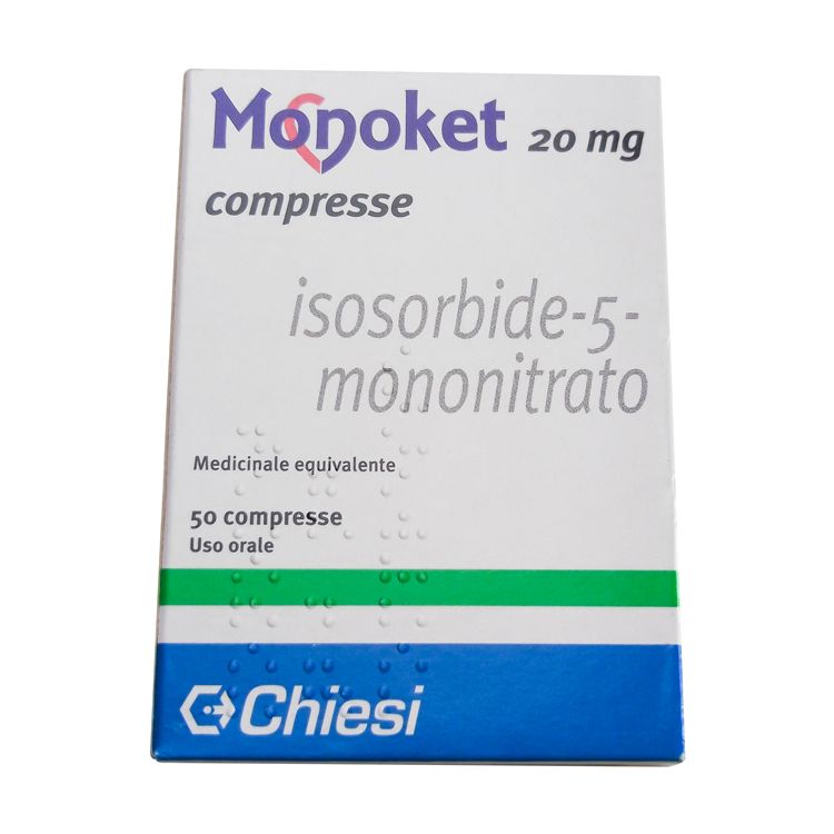 Препарат упакован в картонную коробку белого цвета с фирменным оформлением. На передней стороне коробки крупными буквами указано название препарата "Monoket" с указанием дозировки – 20 мг. Ниже располагается информация о действующем веществе на латинском языке — isosorbide-5-mononitrato. Коробка содержит 50 таблеток, и на ней также указана инструкция по применению: "Uso orale", что означает пероральное применение. Упаковка оформлена с использованием белого, синего и зеленого цветов, а также маркирована логотипом производителя — компании Chiesi.