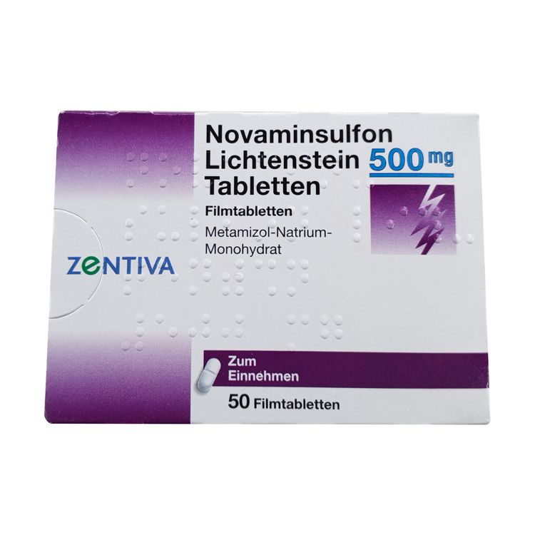 Таблетки помещены в картонную коробку, внутри которой находятся блистеры. На внешней стороне упаковки указано название препарата — "Новаминсульфон", дозировка (500 мг), количество таблеток в упаковке (50 шт.), а также название производителя — Zentiva. На упаковке присутствуют элементы, помогающие идентифицировать лекарство, такие как фирменная эмблема и цветовое оформление (белый и фиолетовый цвета). Присутствуют стандартные надписи на немецком языке, что соответствует нормам маркировки.