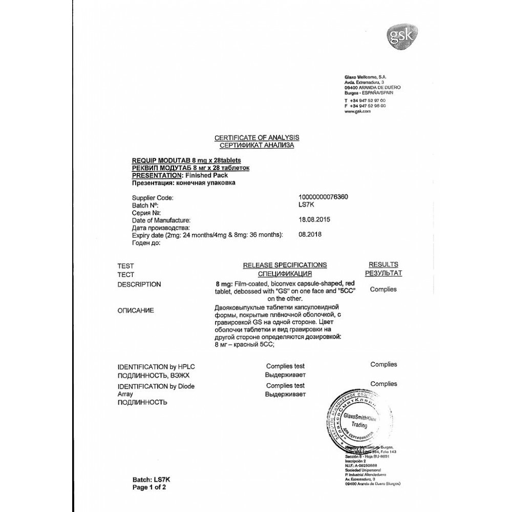 | Реквип Модутаб Requip XL таблетки 8мг №28 | Испания | 4 860 руб. | 28 таблеток |