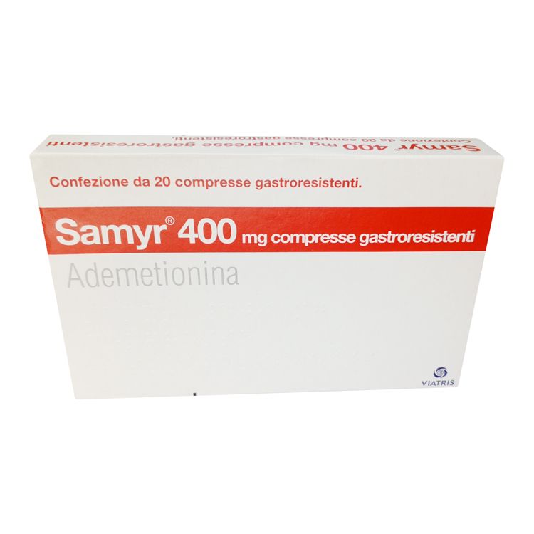 Картонная коробка светлого цвета с чётко обозначенным названием «Samyr 400 мг» и указанием действующего вещества (Ademetionina).
