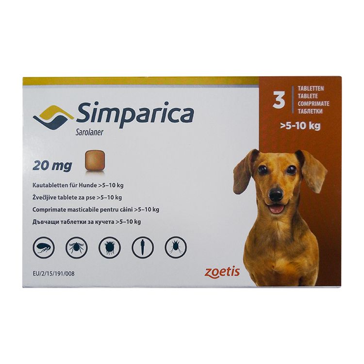 Рекомендуемая доза: 2–4 мг сароланера на 1 кг массы тела собаки в месяц. Для весовой категории 5–10 кг предназначены таблетки с дозировкой 20 мг.