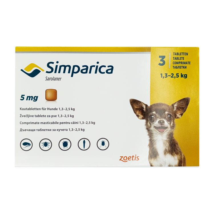 Симпарика выпускается в форме жевательных таблеток, которые собаки обычно охотно поедают. Каждая таблетка содержит 5 мг сароланера, что соответствует потребностям собак массой тела от 1,3 до 2,5 кг. Такая дозировка обеспечивает оптимальный уровень действующего вещества для защиты от блох и клещей.
