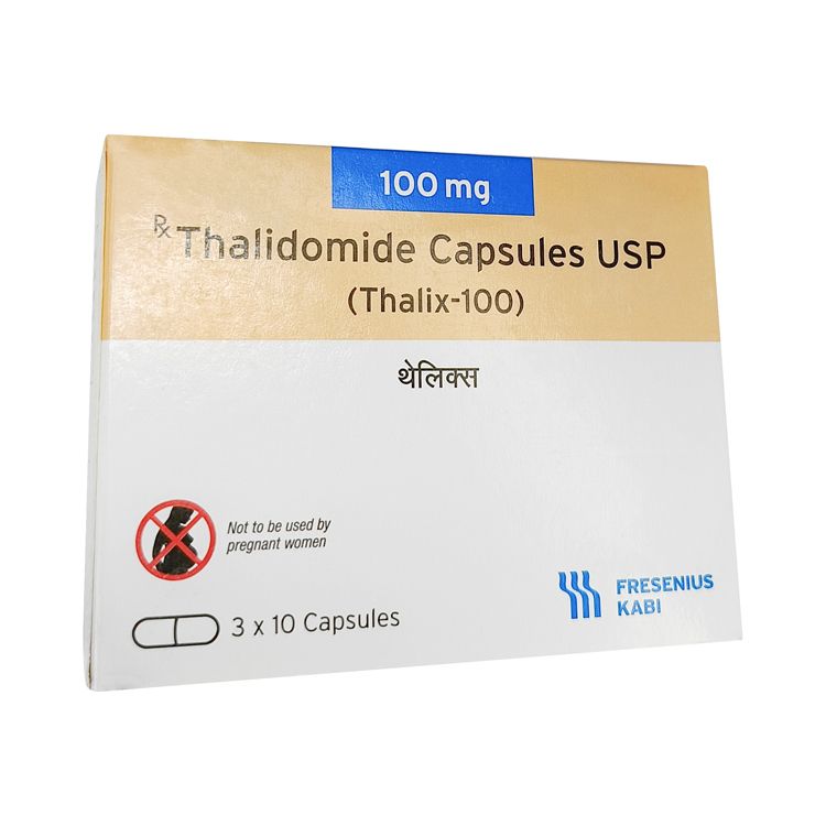 Лекарство обычно поставляется в картонной коробке с указанием торгового наименования (Thalinew / Thalix 100 мг), международного непатентованного наименования (Thalidomide), а также дозировки.