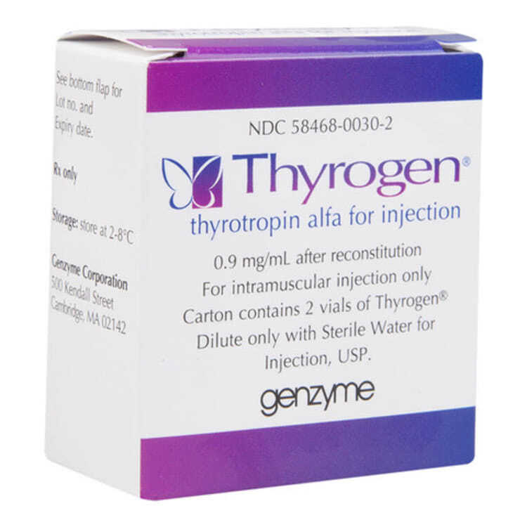 Действующее вещество препарата – гормон передней доли гипофиза, Тиреотропин. Препарат назначают при исследовании на тиреоглобулин, при выявлении остатков щитовидной железы после её удаления при онкозаболеваниях. Вводят только инъекционно, дважды, с суточным интервалом. Тиреотропин усиливает секрецию тироксина, усиливает потребление йода клетками щитовидной железы. Этот механизм и используют в исследовании: после Тирогена через определенное время вводят препарат, который содержит меченые атомы йода. Он захватывается клетками щитовидной железы (если её участки еще остались после операции), и далее островки таких клеток можно увидеть с помощью специальной аппаратуры. Препарат назначают детям только в исключительных случаях (недостаточно данных о его безопасности). При передозировке возможны расстройства функции ЖКТ (тошнота, рвота, ослабление стула), усиленное потоотделение. Описаны и сходные побочные действия, а кроме них – астения, головокружение, нарушение чувствительности, боль в разных частях тела, ощущение холода или лихорадка. Иногда отмечают реакции гиперчувствительности кожного типа, особенно в месте введения. Тироген не используется в периоды беременности и кормления грудью.