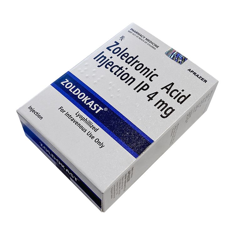 Zoldokast поставляется в стерильной упаковке, содержащей один флакон лиофилизированного порошка для инъекций. Упаковка выполнена в белом и синем цветах с указанием торгового названия препарата и активного компонента — Zoledronic Acid Injection IP 4 mg. На лицевой стороне упаковки можно найти информацию о форме выпуска, а также маркировку о предназначении для внутривенного использования. Упаковка также содержит предупреждение о том, что лекарство должно использоваться исключительно по назначению врача.